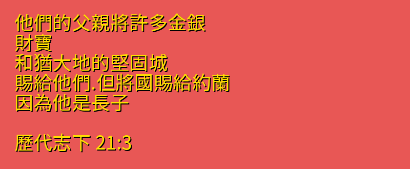 他們的父親將許多金銀、財寶、和猶大地的堅固城、賜給他們.但將國賜給約蘭、因為他是長子。