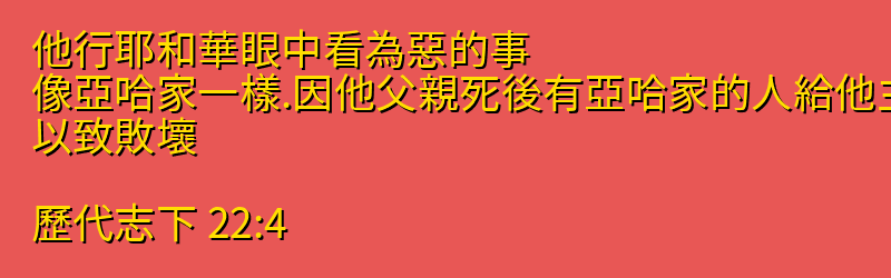 他行耶和華眼中看為惡的事、像亞哈家一樣.因他父親死後有亞哈家的人給他主謀、以致敗壞。