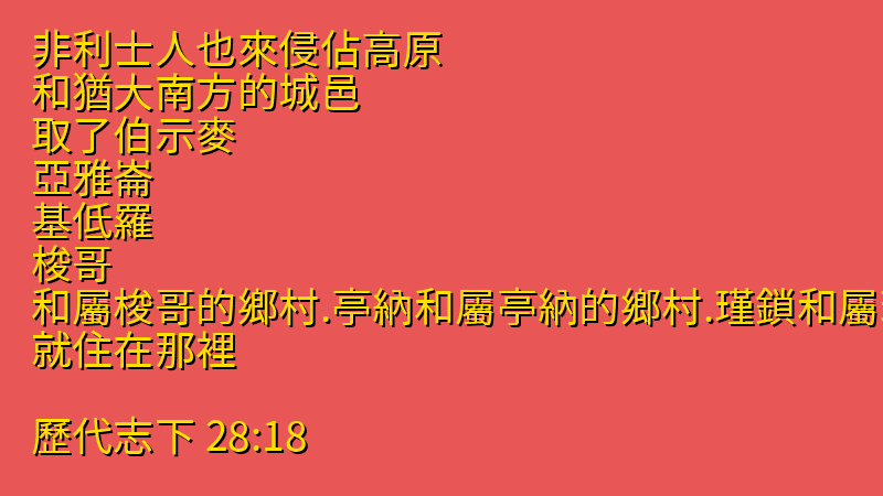 非利士人也來侵佔高原、和猶大南方的城邑、取了伯示麥、亞雅崙、基低羅、梭哥、和屬梭哥的鄉村.亭納和屬亭納的鄉村.瑾鎖和屬瑾鎖的鄉村、就住在那裡。