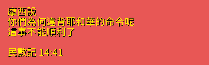 今日分享的中文聖經:「摩西說、你們為何違背耶和華的命令呢、這事不能順利了。」來自聖經「民數記」第「14章41節」,你可以繼續向下拉看到聖經卷書完整章節。每日中文聖經從神的話語中聆聽神的聲音,引導我們的人生,指導我們人生的方向,讓我們做出正確的選擇,而做出這些正確選擇的原則都在聖經中,所以我們需要讀神的話語,認識他的話語,把神的話語藏在心裡。