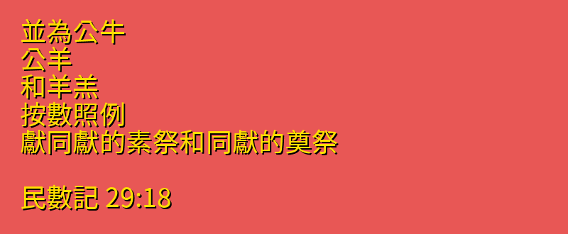今日分享的中文聖經:「並為公牛、公羊、和羊羔、按數照例、獻同獻的素祭和同獻的奠祭。」來自聖經「民數記」第「29章18節」,你可以繼續向下拉看到聖經卷書完整章節。每日中文聖經從神的話語中聆聽神的聲音,引導我們的人生,指導我們人生的方向,讓我們做出正確的選擇,而做出這些正確選擇的原則都在聖經中,所以我們需要讀神的話語,認識他的話語,把神的話語藏在心裡。