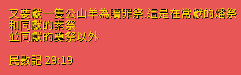 今日分享的中文聖經:「又要獻一隻公山羊為贖罪祭.這是在常獻的燔祭、和同獻的素祭、並同獻的奠祭以外。」來自聖經「民數記」第「29章19節」,你可以繼續向下拉看到聖經卷書完整章節。每日中文聖經從神的話語中聆聽神的聲音,引導我們的人生,指導我們人生的方向,讓我們做出正確的選擇,而做出這些正確選擇的原則都在聖經中,所以我們需要讀神的話語,認識他的話語,把神的話語藏在心裡。