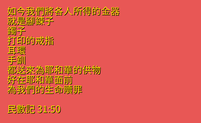 如今我們將各人所得的金器、就是腳鍊子、鐲子、打印的戒指、耳環、手釧、都送來為耶和華的供物、好在耶和華面前、為我們的生命贖罪。