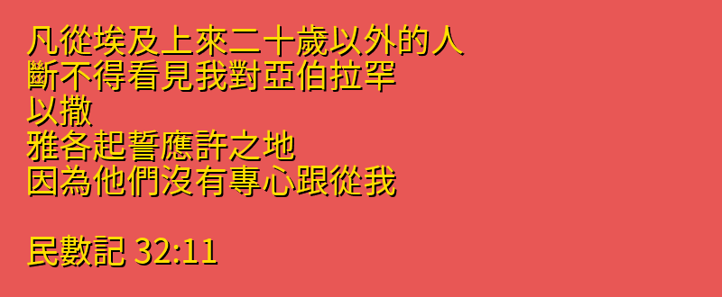凡從埃及上來二十歲以外的人、斷不得看見我對亞伯拉罕、以撒、雅各起誓應許之地、因為他們沒有專心跟從我。