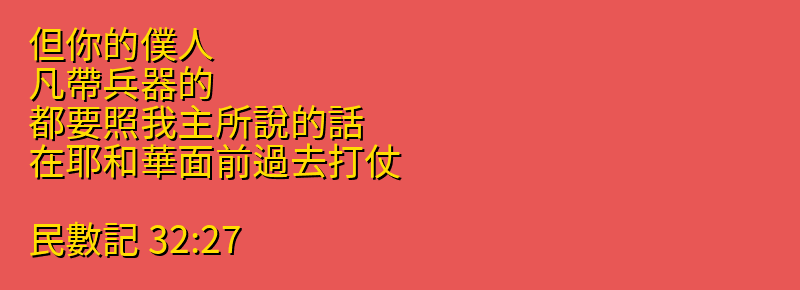 今日分享的中文聖經:「但你的僕人、凡帶兵器的、都要照我主所說的話、在耶和華面前過去打仗。」來自聖經「民數記」第「32章27節」,你可以繼續向下拉看到聖經卷書完整章節。每日中文聖經從神的話語中聆聽神的聲音,引導我們的人生,指導我們人生的方向,讓我們做出正確的選擇,而做出這些正確選擇的原則都在聖經中,所以我們需要讀神的話語,認識他的話語,把神的話語藏在心裡。