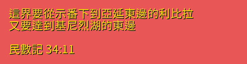 今日分享的中文聖經:「這界要從示番下到亞延東邊的利比拉、又要達到基尼烈湖的東邊。」來自聖經「民數記」第「34章11節」,你可以繼續向下拉看到聖經卷書完整章節。每日中文聖經從神的話語中聆聽神的聲音,引導我們的人生,指導我們人生的方向,讓我們做出正確的選擇,而做出這些正確選擇的原則都在聖經中,所以我們需要讀神的話語,認識他的話語,把神的話語藏在心裡。