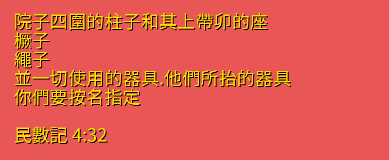 今日分享的中文聖經:「院子四圍的柱子和其上帶卯的座、橛子、繩子、並一切使用的器具.他們所抬的器具、你們要按名指定。」來自聖經「民數記」第「4章32節」,你可以繼續向下拉看到聖經卷書完整章節。每日中文聖經從神的話語中聆聽神的聲音,引導我們的人生,指導我們人生的方向,讓我們做出正確的選擇,而做出這些正確選擇的原則都在聖經中,所以我們需要讀神的話語,認識他的話語,把神的話語藏在心裡。