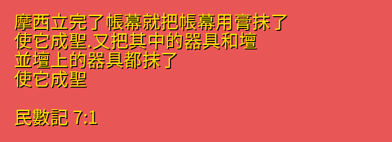 - 7:1 摩西立完了帳幕就把帳幕用膏抹了、使它成聖.又把其中的器具和壇、並壇上的器具都抹了、使它成聖。