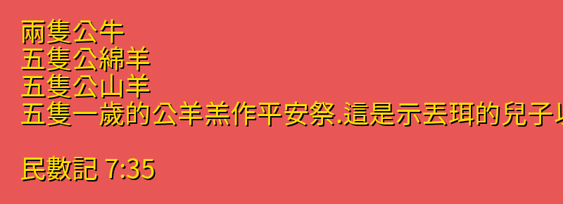 今日分享的中文聖經:「兩隻公牛、五隻公綿羊、五隻公山羊、五隻一歲的公羊羔作平安祭.這是示丟珥的兒子以利蓿的供物。」來自聖經「民數記」第「7章35節」,你可以繼續向下拉看到聖經卷書完整章節。每日中文聖經從神的話語中聆聽神的聲音,引導我們的人生,指導我們人生的方向,讓我們做出正確的選擇,而做出這些正確選擇的原則都在聖經中,所以我們需要讀神的話語,認識他的話語,把神的話語藏在心裡。