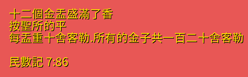 • 7:86 十二個金盂盛滿了香、按聖所的平、每盂重十舍客勒.所有的金子共一百二十舍客勒。