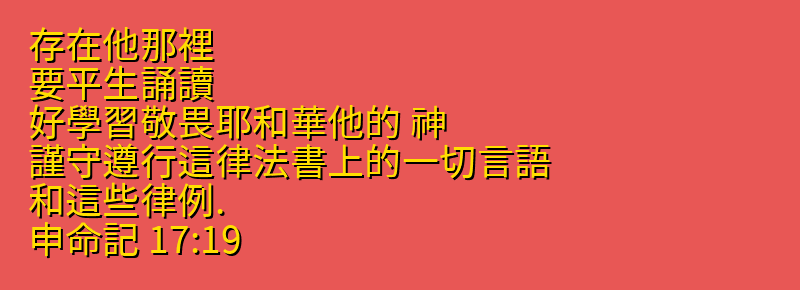 今日分享的中文聖經:「存在他那裡、要平生誦讀、好學習敬畏耶和華他的 神、謹守遵行這律法書上的一切言語、和這些律例.」來自聖經「申命記」第「17章19節」,你可以繼續向下拉看到聖經卷書完整章節。每日中文聖經從神的話語中聆聽神的聲音,引導我們的人生,指導我們人生的方向,讓我們做出正確的選擇,而做出這些正確選擇的原則都在聖經中,所以我們需要讀神的話語,認識他的話語,把神的話語藏在心裡。