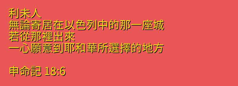 利未人、無論寄居在以色列中的那一座城、若從那裡出來、一心願意到耶和華所選擇的地方、