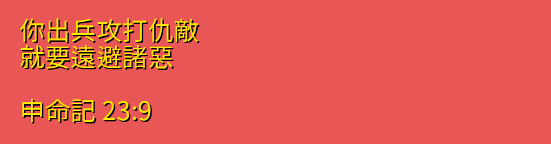 今日分享的中文聖經:「你出兵攻打仇敵、就要遠避諸惡。」來自聖經「申命記」第「23章9節」,你可以繼續向下拉看到聖經卷書完整章節。每日中文聖經從神的話語中聆聽神的聲音,引導我們的人生,指導我們人生的方向,讓我們做出正確的選擇,而做出這些正確選擇的原則都在聖經中,所以我們需要讀神的話語,認識他的話語,把神的話語藏在心裡。