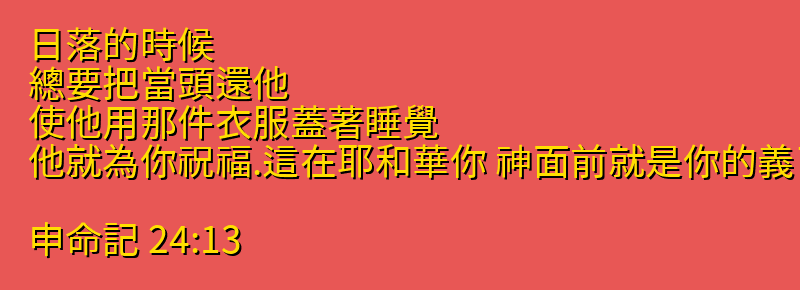 日落的時候、總要把當頭還他、使他用那件衣服蓋著睡覺、他就為你祝福.這在耶和華你 神面前就是你的義了。