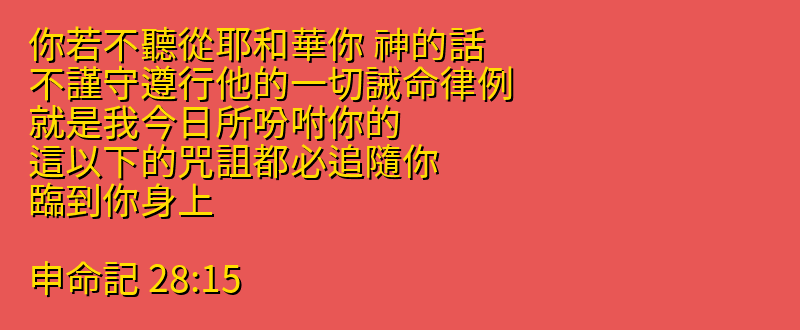 28:2 你若聽從耶和華你 神的話、這以下的福必追隨你、臨到你身上。28:3 你在城裡必蒙福、在田間也必蒙福。28:4 你身所生的、地所產的、牲畜所下的、以及牛犢、羊羔、都必蒙福。28:5 你的筐子和你的摶麵盆、都必蒙福。28:6 你出也蒙福、入也蒙福。28:7 仇敵起來攻擊你、耶和華必使他們在你面前被你殺敗.他們從一條路來攻擊你、必從七條路逃跑。28:8 在你倉房裡、並你手所辦的一切事上、耶和華所命的福必臨到你.耶和華你 神、也要在所給你的地上賜福與你。28:9 你若謹守耶和華你 神的誡命、遵行他的道、他必照著向你所起的誓、立你作為自己的聖民。28:10 天下萬民見你歸在耶和華的名下、就要懼怕你。28:11 你在耶和華向你列祖起誓應許賜你的地上、他必使你身所生的、牲畜所下的、地所產的、都綽綽有餘。28:12 耶和華必為你開天上的府庫、按時降雨在你的地上.在你手裡所辦的一切事上賜福與你.你必借給許多國民、卻不至向他們借貸。28:13 你若聽從耶和華你 神的誡命、就是我今日所吩咐你的、謹守遵行、不偏左右、也不隨從事奉別神、耶和華就必使你作首不作尾、但居上不居下。28:14 見上節28:15 你若不聽從耶和華你 神的話、不謹守遵行他的一切誡命律例、就是我今日所吩咐你的、這以下的咒詛都必追隨你、臨到你身上。28:16 你在城裡必受咒詛、在田間也必受咒詛。28:17 你的筐子和你的摶麵盆、都必受咒詛。28:18 你身所生的、地所產的、以及牛犢、羊羔、都必受咒詛。28:19 你出也受咒詛、入也受咒詛。28:20 耶和華因你行惡離棄他、必在你手裡所辦的一切事上、使咒詛、擾亂、責罰臨到你、直到你被毀滅、速速的滅亡。28:21 耶和華必使瘟疫貼在你身上、直到他將你從所進去得為業的地上滅絕。28:22 耶和華要用癆病、熱病、火症、瘧疾、刀劍、旱風、〔或作乾旱〕霉爛攻擊你.這都要追趕你直到你滅亡。28:23 你頭上的天、要變為銅、腳下的地、要變為鐵。28:24 耶和華要使那降在你地上的雨、變為塵沙、從天臨在你身上、直到你滅亡。28:25 耶和華必使你敗在仇敵面前、你從一條路去攻擊他們、必從七條路逃跑.你必在天下萬國中拋來拋去。28:26 你的屍首必給空中的飛鳥、和地上的走獸作食物、並無人鬨趕。28:27 耶和華必用埃及人的瘡、並痔瘡、牛皮癬、與疥、攻擊你、使你不能醫治。28:28 耶和華必用癲狂、眼瞎、心驚攻擊你。28:29 你必在午間摸索、好像瞎子在暗中摸索一樣.你所行的必不亨通、時常遭遇欺壓、搶奪、無人搭救。28:30 你聘定了妻、別人必與他同房.你建造房屋、不得住在其內、你栽種葡萄園、也不得用其中的果子。28:31 你的牛在你眼前宰了、你必不得喫他的肉、你的驢在你眼前被搶奪、不得歸還.你的羊歸了仇敵、無人搭救。28:32 你的兒女必歸與別國的民、你的眼目終日切望、甚至失明、你手中無力拯救。28:33 你的土產、和你勞碌得來的、必被你所不認識的國民喫盡.你時常被欺負、受壓制.28:34 甚至你因眼中所看見的、必致瘋狂。28:35 耶和華必攻擊你、使你膝上、腿上、從腳掌到頭頂、長毒瘡無法醫治。28:36 耶和華必將你和你所立的王、領到你和你列祖素不認識的國去、在那裡你必事奉木頭石頭的神。28:37 你在耶和華領你到的各國中、要令人驚駭、笑談、譏誚。28:38 你帶到田間的種子雖多、收進來的卻少、因為被蝗蟲喫了。28:39 你栽種修理葡萄園、卻不得收葡萄、也不得喝葡萄酒、因為被蟲子喫了。28:40 你全境有橄欖樹、卻不得其油抹身、因為樹上的橄欖不熟自落了。28:41 你生兒養女、卻不算是你的、因為必被擄去。28:42 你所有的樹木、和你地裡的出產、必被蝗蟲所喫。28:43 在你中間寄居的、必漸漸上升、比你高而又高、你必漸漸下降、低而又低。28:44 他必借給你、你卻不能借給他、他必作首、你必作尾。28:45 這一切咒詛必追隨你、趕上你、直到你滅亡、因為你不聽從耶和華你 神的話、不遵守他所吩咐的誡命律例。28:46 這些咒詛、必在你和你後裔的身上成為異蹟、奇事、直到永遠。28:47 因為你富有的時候、不歡心樂意地事奉耶和華你的 神、28:48 所以你必在飢餓、乾渴、赤露、缺乏之中、事奉耶和華所打發來攻擊你的仇敵.他必把鐵軛加在你的頸項上、直到將你滅絕。28:49 耶和華要從遠方地極帶一國的民、如鷹飛來攻擊你.這民的言語你不懂得。28:50 這民的面貌兇惡、不顧恤年老的、也不恩待年少的。28:51 他們必喫你牲畜所下的、和你地土所產的、直到你滅亡.你的五穀、新酒、和油、以及牛犢、羊羔、都不給你留下、直到將你滅絕。28:52 他們必將你困在你各城裡、直到你所倚靠高大堅固的城牆、都被攻塌.他們必將你困在耶和華你 神所賜你遍地的各城裡。28:53 你在仇敵圍困窘迫之中、必喫你本身所生的、就是耶和華你 神所賜給你的兒女之肉。28:54 你們中間柔弱嬌嫩的人、必惡眼看他弟兄、和他懷中的妻、並他餘剩的兒女.28:55 甚至在你受仇敵圍困窘迫的城中、他要喫兒女的肉、不肯分一點給他的親人、因為他一無所剩。28:56 你們中間柔弱嬌嫩的婦人、是因嬌嫩柔弱不肯把腳踏地的、必惡眼看他懷中的丈夫和他的兒女。28:57 他兩腿中間出來的嬰孩、與他所要生的兒女、他因缺乏一切、就要在你受仇敵圍困窘迫的城中、將他們暗暗的喫了。28:58 這書上所寫律