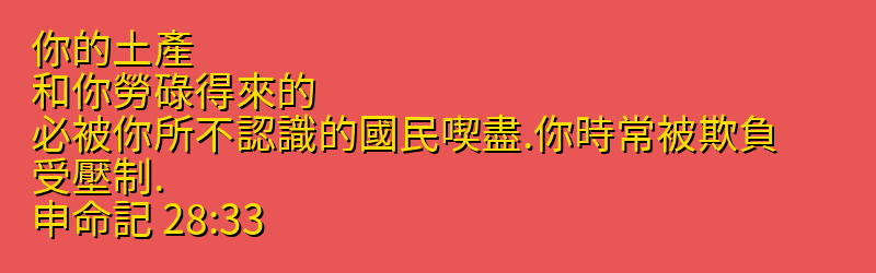28:2 你若聽從耶和華你 神的話、這以下的福必追隨你、臨到你身上。28:3 你在城裡必蒙福、在田間也必蒙福。28:4 你身所生的、地所產的、牲畜所下的、以及牛犢、羊羔、都必蒙福。28:5 你的筐子和你的摶麵盆、都必蒙福。28:6 你出也蒙福、入也蒙福。28:7 仇敵起來攻擊你、耶和華必使他們在你面前被你殺敗.他們從一條路來攻擊你、必從七條路逃跑。28:8 在你倉房裡、並你手所辦的一切事上、耶和華所命的福必臨到你.耶和華你 神、也要在所給你的地上賜福與你。28:9 你若謹守耶和華你 神的誡命、遵行他的道、他必照著向你所起的誓、立你作為自己的聖民。28:10 天下萬民見你歸在耶和華的名下、就要懼怕你。28:11 你在耶和華向你列祖起誓應許賜你的地上、他必使你身所生的、牲畜所下的、地所產的、都綽綽有餘。28:12 耶和華必為你開天上的府庫、按時降雨在你的地上.在你手裡所辦的一切事上賜福與你.你必借給許多國民、卻不至向他們借貸。28:13 你若聽從耶和華你 神的誡命、就是我今日所吩咐你的、謹守遵行、不偏左右、也不隨從事奉別神、耶和華就必使你作首不作尾、但居上不居下。28:14 見上節28:15 你若不聽從耶和華你 神的話、不謹守遵行他的一切誡命律例、就是我今日所吩咐你的、這以下的咒詛都必追隨你、臨到你身上。28:16 你在城裡必受咒詛、在田間也必受咒詛。28:17 你的筐子和你的摶麵盆、都必受咒詛。28:18 你身所生的、地所產的、以及牛犢、羊羔、都必受咒詛。28:19 你出也受咒詛、入也受咒詛。28:20 耶和華因你行惡離棄他、必在你手裡所辦的一切事上、使咒詛、擾亂、責罰臨到你、直到你被毀滅、速速的滅亡。28:21 耶和華必使瘟疫貼在你身上、直到他將你從所進去得為業的地上滅絕。28:22 耶和華要用癆病、熱病、火症、瘧疾、刀劍、旱風、〔或作乾旱〕霉爛攻擊你.這都要追趕你直到你滅亡。28:23 你頭上的天、要變為銅、腳下的地、要變為鐵。28:24 耶和華要使那降在你地上的雨、變為塵沙、從天臨在你身上、直到你滅亡。28:25 耶和華必使你敗在仇敵面前、你從一條路去攻擊他們、必從七條路逃跑.你必在天下萬國中拋來拋去。28:26 你的屍首必給空中的飛鳥、和地上的走獸作食物、並無人鬨趕。28:27 耶和華必用埃及人的瘡、並痔瘡、牛皮癬、與疥、攻擊你、使你不能醫治。28:28 耶和華必用癲狂、眼瞎、心驚攻擊你。28:29 你必在午間摸索、好像瞎子在暗中摸索一樣.你所行的必不亨通、時常遭遇欺壓、搶奪、無人搭救。28:30 你聘定了妻、別人必與他同房.你建造房屋、不得住在其內、你栽種葡萄園、也不得用其中的果子。28:31 你的牛在你眼前宰了、你必不得喫他的肉、你的驢在你眼前被搶奪、不得歸還.你的羊歸了仇敵、無人搭救。28:32 你的兒女必歸與別國的民、你的眼目終日切望、甚至失明、你手中無力拯救。28:33 你的土產、和你勞碌得來的、必被你所不認識的國民喫盡.你時常被欺負、受壓制.28:34 甚至你因眼中所看見的、必致瘋狂。28:35 耶和華必攻擊你、使你膝上、腿上、從腳掌到頭頂、長毒瘡無法醫治。28:36 耶和華必將你和你所立的王、領到你和你列祖素不認識的國去、在那裡你必事奉木頭石頭的神。28:37 你在耶和華領你到的各國中、要令人驚駭、笑談、譏誚。28:38 你帶到田間的種子雖多、收進來的卻少、因為被蝗蟲喫了。28:39 你栽種修理葡萄園、卻不得收葡萄、也不得喝葡萄酒、因為被蟲子喫了。28:40 你全境有橄欖樹、卻不得其油抹身、因為樹上的橄欖不熟自落了。28:41 你生兒養女、卻不算是你的、因為必被擄去。28:42 你所有的樹木、和你地裡的出產、必被蝗蟲所喫。28:43 在你中間寄居的、必漸漸上升、比你高而又高、你必漸漸下降、低而又低。28:44 他必借給你、你卻不能借給他、他必作首、你必作尾。28:45 這一切咒詛必追隨你、趕上你、直到你滅亡、因為你不聽從耶和華你 神的話、不遵守他所吩咐的誡命律例。28:46 這些咒詛、必在你和你後裔的身上成為異蹟、奇事、直到永遠。28:47 因為你富有的時候、不歡心樂意地事奉耶和華你的 神、28:48 所以你必在飢餓、乾渴、赤露、缺乏之中、事奉耶和華所打發來攻擊你的仇敵.他必把鐵軛加在你的頸項上、直到將你滅絕。28:49 耶和華要從遠方地極帶一國的民、如鷹飛來攻擊你.這民的言語你不懂得。28:50 這民的面貌兇惡、不顧恤年老的、也不恩待年少的。28:51 他們必喫你牲畜所下的、和你地土所產的、直到你滅亡.你的五穀、新酒、和油、以及牛犢、羊羔、都不給你留下、直到將你滅絕。28:52 他們必將你困在你各城裡、直到你所倚靠高大堅固的城牆、都被攻塌.他們必將你困在耶和華你 神所賜你遍地的各城裡。28:53 你在仇敵圍困窘迫之中、必喫你本身所生的、就是耶和華你 神所賜給你的兒女之肉。28:54 你們中間柔弱嬌嫩的人、必惡眼看他弟兄、和他懷中的妻、並他餘剩的兒女.28:55 甚至在你受仇敵圍困窘迫的城中、他要喫兒女的肉、不肯分一點給他的親人、因為他一無所剩。28:56 你們中間柔弱嬌嫩的婦人、是因嬌嫩柔弱不肯把腳踏地的、必惡眼看他懷中的丈夫和他的兒女。28:57 他兩腿中間出來的嬰孩、與他所要生的兒女、他因缺乏一切、就要在你受仇敵圍困窘迫的城中、將他們暗暗的喫了。28:58 這書上所寫律