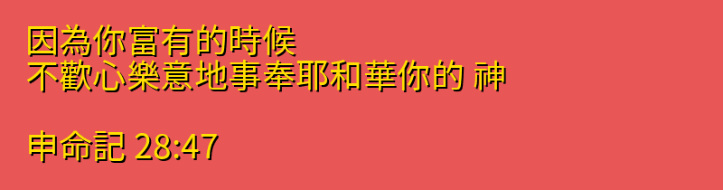 • 28:47 因為你富有的時候、不歡心樂意地事奉耶和華你的 神、