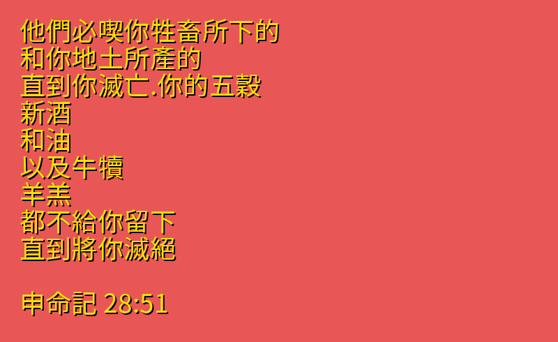 • 28:51 他們必喫你牲畜所下的、和你地土所產的、直到你滅亡.你的五穀、新酒、和油、以及牛犢、羊羔、都不給你留下、直到將你滅絕。