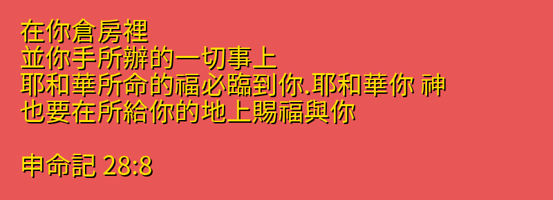 • 28:8 在你倉房裡、並你手所辦的一切事上、耶和華所命的福必臨到你.耶和華你 神、也要在所給你的地上賜福與你。