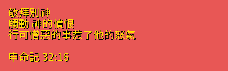 今日分享的中文聖經:「敬拜別神、觸動 神的憤恨、行可憎惡的事惹了他的怒氣。」來自聖經「申命記」第「32章16節」,你可以繼續向下拉看到聖經卷書完整章節。每日中文聖經從神的話語中聆聽神的聲音,引導我們的人生,指導我們人生的方向,讓我們做出正確的選擇,而做出這些正確選擇的原則都在聖經中,所以我們需要讀神的話語,認識他的話語,把神的話語藏在心裡。