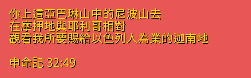 今日分享的中文聖經:「你上這亞巴琳山中的尼波山去、在摩押地與耶利哥相對、觀看我所要賜給以色列人為業的迦南地。」來自聖經「申命記」第「32章49節」,你可以繼續向下拉看到聖經卷書完整章節。每日中文聖經從神的話語中聆聽神的聲音,引導我們的人生,指導我們人生的方向,讓我們做出正確的選擇,而做出這些正確選擇的原則都在聖經中,所以我們需要讀神的話語,認識他的話語,把神的話語藏在心裡。