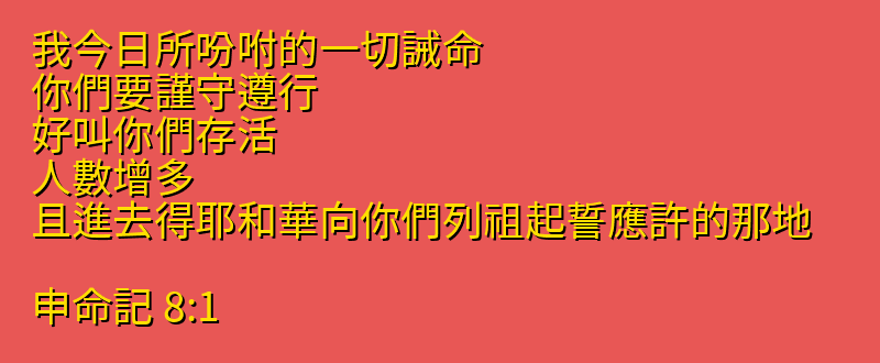 - 8:1 我今日所吩咐的一切誡命、你們要謹守遵行、好叫你們存活、人數增多、且進去得耶和華向你們列祖起誓應許的那地。