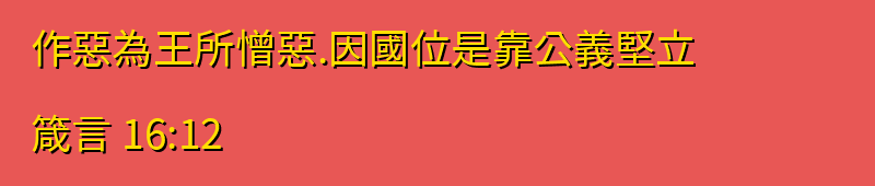 今日分享的中文聖經:「作惡為王所憎惡.因國位是靠公義堅立。」來自聖經「箴言」第「16章12節」,你可以繼續向下拉看到聖經卷書完整章節。每日中文聖經從神的話語中聆聽神的聲音,引導我們的人生,指導我們人生的方向,讓我們做出正確的選擇,而做出這些正確選擇的原則都在聖經中,所以我們需要讀神的話語,認識他的話語,把神的話語藏在心裡。