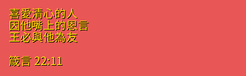 今日分享的中文聖經:「喜愛清心的人、因他嘴上的恩言、王必與他為友。」來自聖經「箴言」第「22章11節」,你可以繼續向下拉看到聖經卷書完整章節。每日中文聖經從神的話語中聆聽神的聲音,引導我們的人生,指導我們人生的方向,讓我們做出正確的選擇,而做出這些正確選擇的原則都在聖經中,所以我們需要讀神的話語,認識他的話語,把神的話語藏在心裡。