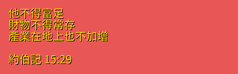 今日分享的中文聖經:「他不得富足、財物不得常存、產業在地上也不加增。」來自聖經「約伯記」第「15章29節」,你可以繼續向下拉看到聖經卷書完整章節。每日中文聖經從神的話語中聆聽神的聲音,引導我們的人生,指導我們人生的方向,讓我們做出正確的選擇,而做出這些正確選擇的原則都在聖經中,所以我們需要讀神的話語,認識他的話語,把神的話語藏在心裡。