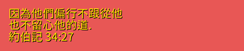 今日分享的中文聖經:「因為他們偏行不跟從他、也不留心他的道.」來自聖經「約伯記」第「34章27節」,你可以繼續向下拉看到聖經卷書完整章節。每日中文聖經從神的話語中聆聽神的聲音,引導我們的人生,指導我們人生的方向,讓我們做出正確的選擇,而做出這些正確選擇的原則都在聖經中,所以我們需要讀神的話語,認識他的話語,把神的話語藏在心裡。