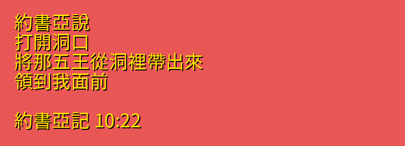 今日分享的中文聖經:「約書亞說、打開洞口、將那五王從洞裡帶出來、領到我面前。」來自聖經「約書亞記」第「10章22節」,你可以繼續向下拉看到聖經卷書完整章節。每日中文聖經從神的話語中聆聽神的聲音,引導我們的人生,指導我們人生的方向,讓我們做出正確的選擇,而做出這些正確選擇的原則都在聖經中,所以我們需要讀神的話語,認識他的話語,把神的話語藏在心裡。
