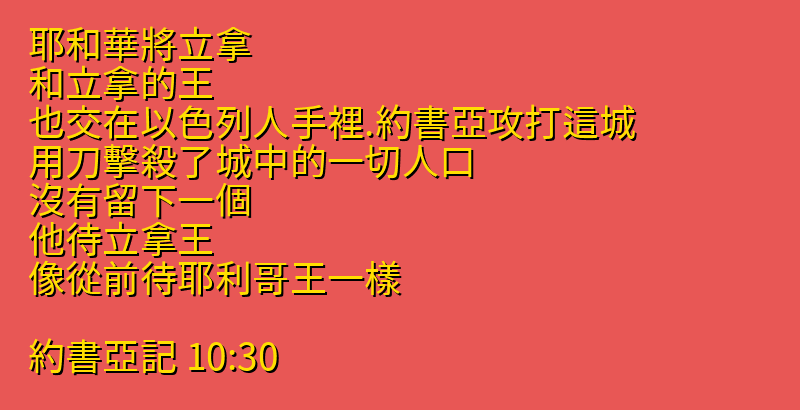 耶和華將立拿、和立拿的王、也交在以色列人手裡.約書亞攻打這城、用刀擊殺了城中的一切人口、沒有留下一個、他待立拿王、像從前待耶利哥王一樣。