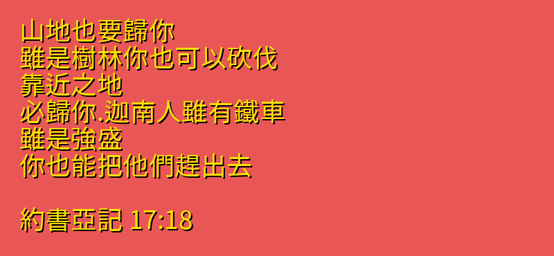 山地也要歸你、雖是樹林你也可以砍伐、靠近之地、必歸你.迦南人雖有鐵車、雖是強盛、你也能把他們趕出去。