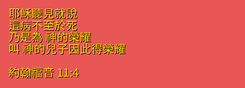 耶穌聽見就說、這病不至於死、乃是為 神的榮耀、叫 神的兒子因此得榮耀。