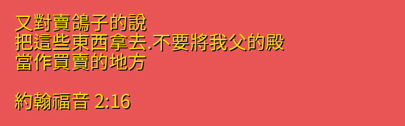 今日分享的中文聖經:「又對賣鴿子的說、把這些東西拿去.不要將我父的殿、當作買賣的地方。」來自聖經「約翰福音」第「2章16節」,你可以繼續向下拉看到聖經卷書完整章節。每日中文聖經從神的話語中聆聽神的聲音,引導我們的人生,指導我們人生的方向,讓我們做出正確的選擇,而做出這些正確選擇的原則都在聖經中,所以我們需要讀神的話語,認識他的話語,把神的話語藏在心裡。