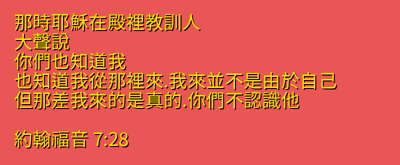那時耶穌在殿裡教訓人、大聲說、你們也知道我、也知道我從那裡來.我來並不是由於自己、但那差我來的是真的.你們不認識他。