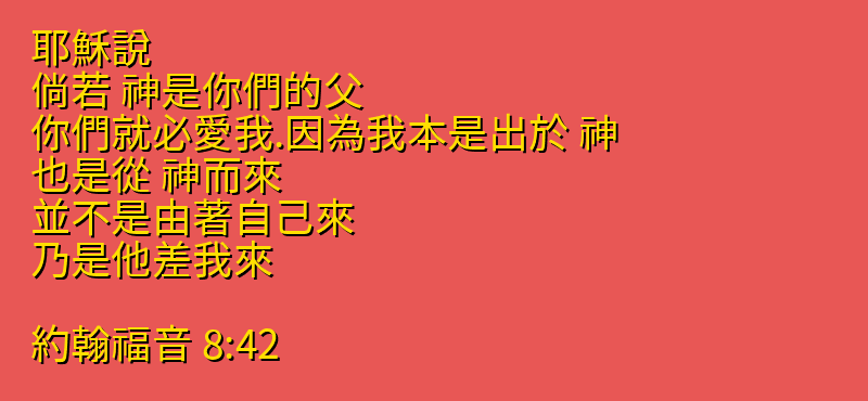 今日分享的中文聖經:「耶穌說、倘若 神是你們的父、你們就必愛我.因為我本是出於 神、也是從 神而來、並不是由著自己來、乃是他差我來。」來自聖經「約翰福音」第「8章42節」,你可以繼續向下拉看到聖經卷書完整章節。每日中文聖經從神的話語中聆聽神的聲音,引導我們的人生,指導我們人生的方向,讓我們做出正確的選擇,而做出這些正確選擇的原則都在聖經中,所以我們需要讀神的話語,認識他的話語,把神的話語藏在心裡。