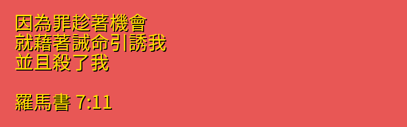 今日分享的中文聖經:「因為罪趁著機會、就藉著誡命引誘我、並且殺了我。」來自聖經「羅馬書」第「7章11節」,你可以繼續向下拉看到聖經卷書完整章節。每日中文聖經從神的話語中聆聽神的聲音,引導我們的人生,指導我們人生的方向,讓我們做出正確的選擇,而做出這些正確選擇的原則都在聖經中,所以我們需要讀神的話語,認識他的話語,把神的話語藏在心裡。
