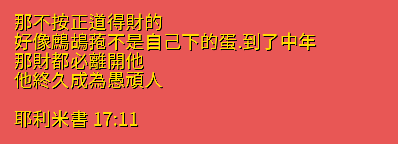 那不按正道得財的、好像鷓鴣菢不是自己下的蛋.到了中年、那財都必離開他、他終久成為愚頑人。