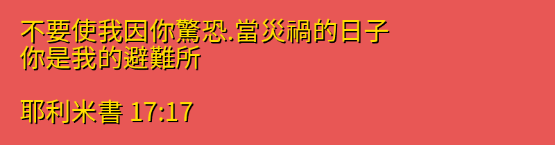 今日分享的中文聖經:「不要使我因你驚恐.當災禍的日子、你是我的避難所。」來自聖經「耶利米書」第「17章17節」,你可以繼續向下拉看到聖經卷書完整章節。每日中文聖經從神的話語中聆聽神的聲音,引導我們的人生,指導我們人生的方向,讓我們做出正確的選擇,而做出這些正確選擇的原則都在聖經中,所以我們需要讀神的話語,認識他的話語,把神的話語藏在心裡。