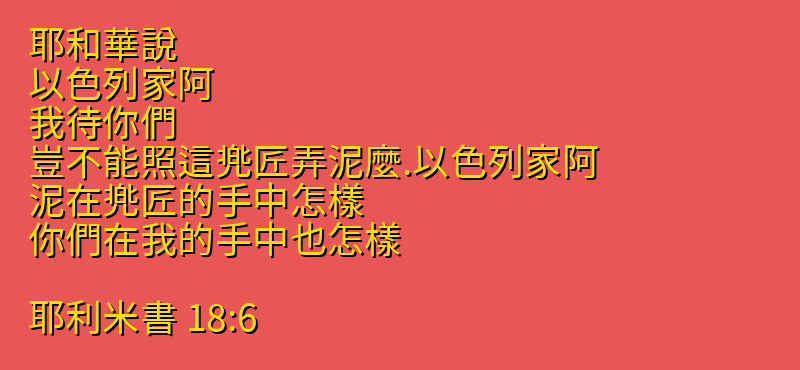 耶和華說、以色列家阿、我待你們、豈不能照這兠匠弄泥麼.以色列家阿、泥在兠匠的手中怎樣、你們在我的手中也怎樣。