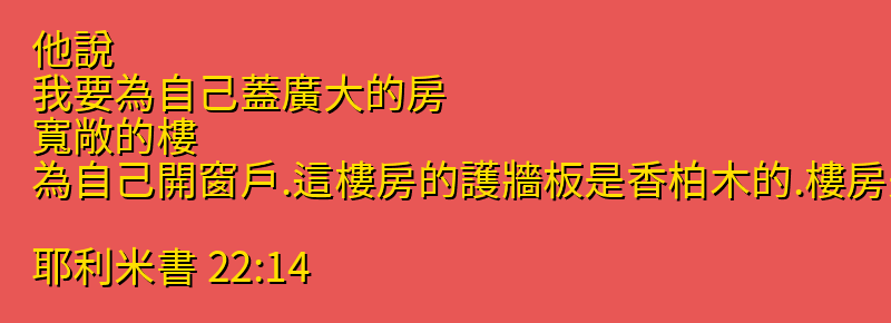 他說、我要為自己蓋廣大的房、寬敞的樓、為自己開窗戶.這樓房的護牆板是香柏木的.樓房是丹色油漆的。