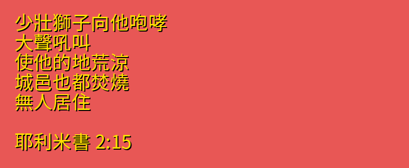 少壯獅子向他咆哮、大聲吼叫、使他的地荒涼、城邑也都焚燒、無人居住。