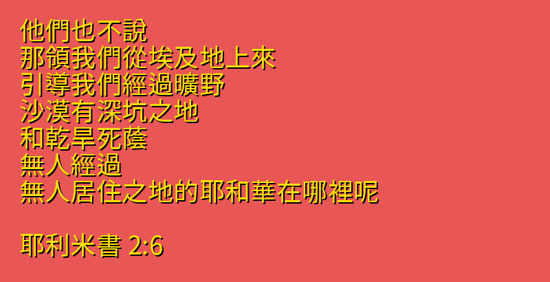 他們也不說、那領我們從埃及地上來、引導我們經過曠野、沙漠有深坑之地、和乾旱死蔭、無人經過、無人居住之地的耶和華在哪裡呢。