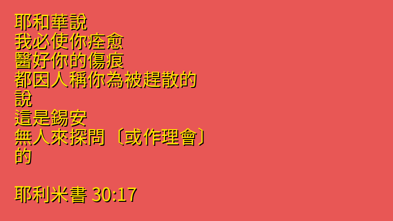 耶和華說、我必使你痊愈、醫好你的傷痕、都因人稱你為被趕散的、說、這是錫安、無人來探問〔或作理會〕的。