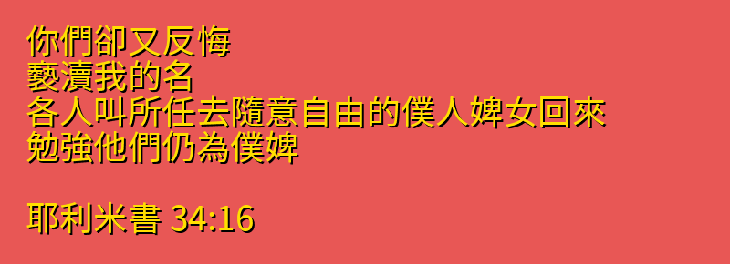 • 34:16 你們卻又反悔、褻瀆我的名、各人叫所任去隨意自由的僕人婢女回來、勉強他們仍為僕婢。