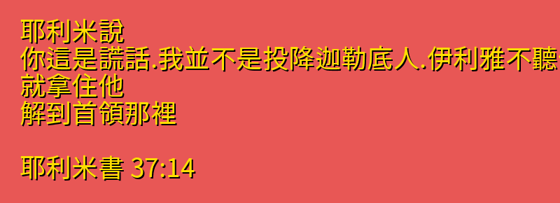 今日分享的中文聖經:「耶利米說、你這是謊話.我並不是投降迦勒底人.伊利雅不聽他的話、就拿住他、解到首領那裡。」來自聖經「耶利米書」第「37章14節」,你可以繼續向下拉看到聖經卷書完整章節。每日中文聖經從神的話語中聆聽神的聲音,引導我們的人生,指導我們人生的方向,讓我們做出正確的選擇,而做出這些正確選擇的原則都在聖經中,所以我們需要讀神的話語,認識他的話語,把神的話語藏在心裡。