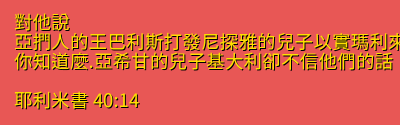 對他說、亞捫人的王巴利斯打發尼探雅的兒子以實瑪利來要你的命、你知道麼.亞希甘的兒子基大利卻不信他們的話。