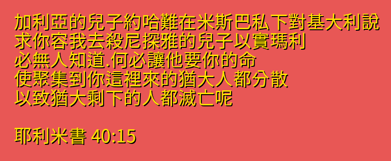 加利亞的兒子約哈難在米斯巴私下對基大利說、求你容我去殺尼探雅的兒子以實瑪利、必無人知道.何必讓他要你的命、使聚集到你這裡來的猶大人都分散、以致猶大剩下的人都滅亡呢。