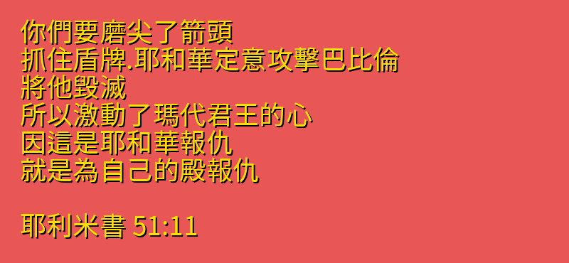 你們要磨尖了箭頭、抓住盾牌.耶和華定意攻擊巴比倫、將他毀滅、所以激動了瑪代君王的心、因這是耶和華報仇、就是為自己的殿報仇。